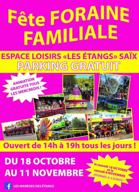 La fête foraine se déroulera du samedi 18 octobre au mercredi 11 novembre, tous les jours de 14h à 19h, à l'espace de loisirs "Les Etangs" à Saïx.